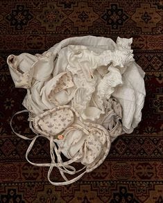 ii. I have a bed full of stains, of babe, of child, a slow progression into girl. There are stains I don’t like to remember and so I rub them with sugar or salt, the hot water and they fade until my sheets are pure enough that from a distance they look new. Nothing is new. My curtains are cream lace and soft cotton, slightly ripped at the bottom from years of catching them on the bottom of my feet when dancing around my room. They tangle in my toes and kiss along the scar, and when I stood on the roses I placed out to cut the stems, I got a thorn stuck in my toe and it bled and I cut that piece of lace out. I didn’t like to think of it, sitting there, next to its seafoam sisters, feeling dirty, forgotten, derogatory.
