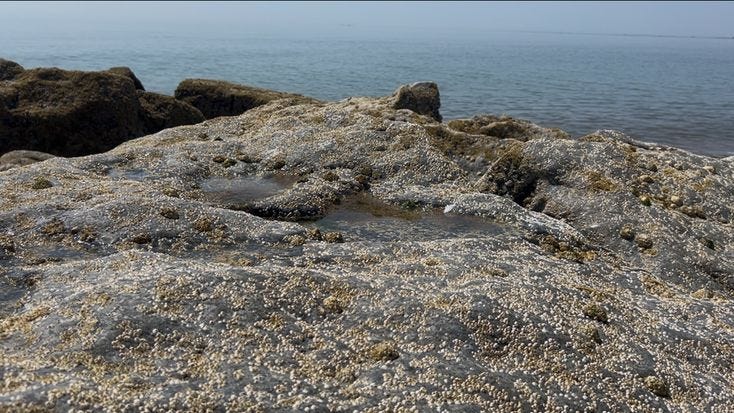 found again at the start of December. The sea at my feet. Hours later. Somewhere the floor must drop, and I do not know how deep. I have never been a good swimmer. There are a cluster of them. The sea beating over them. They are here each time. Holding onto each other. Their bodies are coated in seaweed. If I ask nicely they’ll let me reach between them and pull a perfectly preserved shell from between their lips. Aphrodite sleeps there.